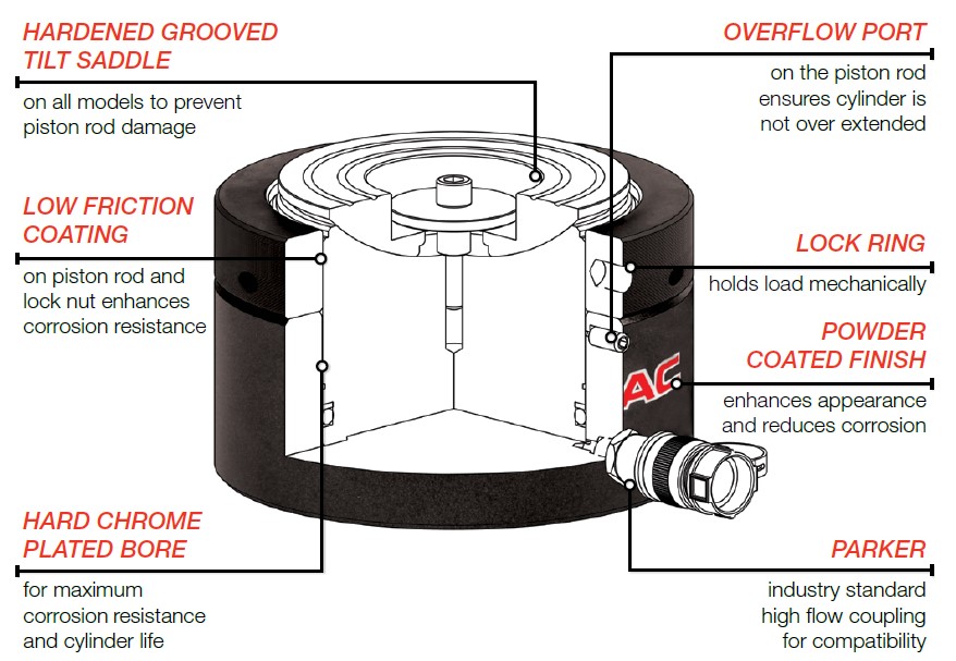 The RPLC-Series is a Single Acting, Load Return, Pancake, Locking Collar Cylinder. It is a compact design that features a threaded piston rod and lock ring. These cylinders are ideally suited to bridge construction and maintenance.